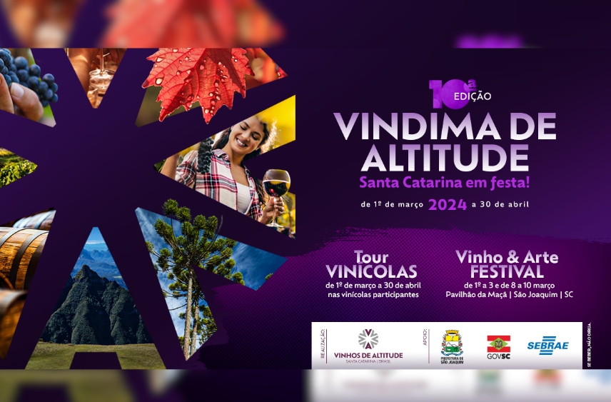 A 10ª Vindima de Altitude de Santa Catarina se prepara para encantar os amantes de vinho! De 1 de março a 30 de abril, às vinícolas da Serra Catarinense se tornarão palco da celebração da colheita da uva no estado. Um dos destaques é o Vinho e Arte Festival, o evento ocorre durante a Vindima, nos dois fins de semana de março, de 1 a 3 e de 8 a 10 no pavilhão principal do parque da Maçã, em São Joaquim. Além das degustações, os visitantes poderão explorar a gastronomia local e se envolver com uma rica programação cultural e musical.